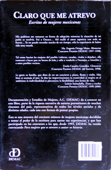 Este volumen reúne cerca de doscientos fragmentos, parte de la riqueza narrativa de los textos participantes en los concursos DEMAC Para mujeres que se atreven a contar su historia, desde 1993. Los testimonios reflejan las ocupaciones y preocupaciones de autoras originarias de todos los rincones del país, representativas de todos los niveles sociales y de distintas edades.