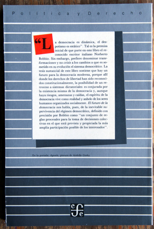 "La democracia es dinámica, el despotismo es estático." Tal es la premisa inicial de que parte en este libro el reconocido escritor italiano Norberto Bobbio. Sin embargo, prefiere denominar 'transformaciones' y no 'crisis' a los cambios a que es sometido en su evolución el sistema democrático. La tesis sustancial de este libro sostiene que hay un futuro para la democracia moderna, porque allí donde los derechos de libertad han sido reconocidos constitucionalmente, la posibilidad de un retroceso a sistemas dictatoriales es conjurada por la existencia misma de la democracia y, aunque haya riesgos, amenazas y caídas, el espíritu de la democracia vive como realidad y anhelo de los seres humanos organizados socialmente. 'El Futuro de la democracia' nos habla, pues, de la inevitable supervivencia del régimen democrático, definido con precisión por Bobbio como "un conjunto de reglas procesales para la toma de decisiones colectivas en el que está prevista y propiciada la más amplia participación posible de los interesados".