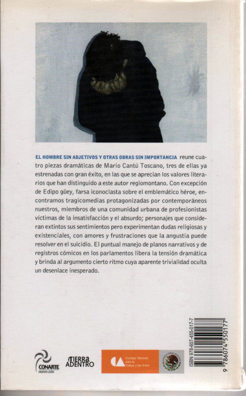 El hombre sin adjetivos y otras obras sin importancia reúne cuatro piezas dramáticas de Mario Cantú Toscano, tres de ellas ya estrenadas con gran éxito, en las que se aprecian los valores literarios que han distinguido a este autor regiomontano. Con excepción de Edipo güey, farsa iconoclasta sobre el emblemático héroe, encontramos tragicomedias protagonizadas por contemporáneos nuestros, miembros de una comunidad urbana de profesionistas víctimas de la insatisfacción y el absurdo; personajes que consideran extintos sus sentimientos pero experimentan dudas religiosas y existenciales, con amores y frustraciones que la angustia puede resolver en el suicidio. El puntual manejo de planos narrativos y de registros cómicos en los parlamentos libera la tensión dramática y brinda al argumento cierto ritmo cuya aparente trivialidad oculta un desenlace inesperado.