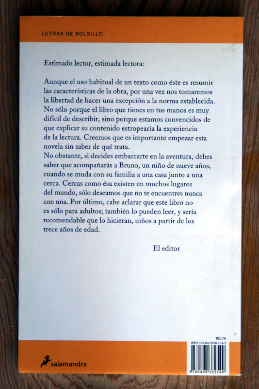No obstante, si decides embarcarte en la aventura, debes saber que acompañarás a Bruno, un niño de nueve años, cuando se muda con su familia a una casa junto a una cerca. Cercas como ésa existen en muchos sitios del mundo, sólo deseamos que no te encuentres nunca con una. Por último, cabe aclarar que este libro no es sólo para adultos; también lo pueden leer, y sería recomendable que lo hicieran, niños a partir de los trece años de edad.
