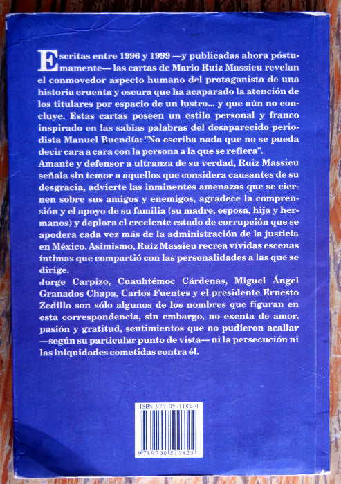 Escritas entre 1996 y 1999 -y publicadas ahora póstumamente- las cartas de Mario Ruíz Massieu revelan el conmovedor aspecto humano del protagonista de una historia cruenta y oscura que ha acaparado la atención de los titulares por espacio de un lustro… y que aún no concluye. Estas cartas poseen un estilo personal y franco inspirado en las sabías palabras del desaparecido periodista Manuel Buendía: ’No escriba nada que no se pueda decir cara a cara con la persona a la que se refiera».