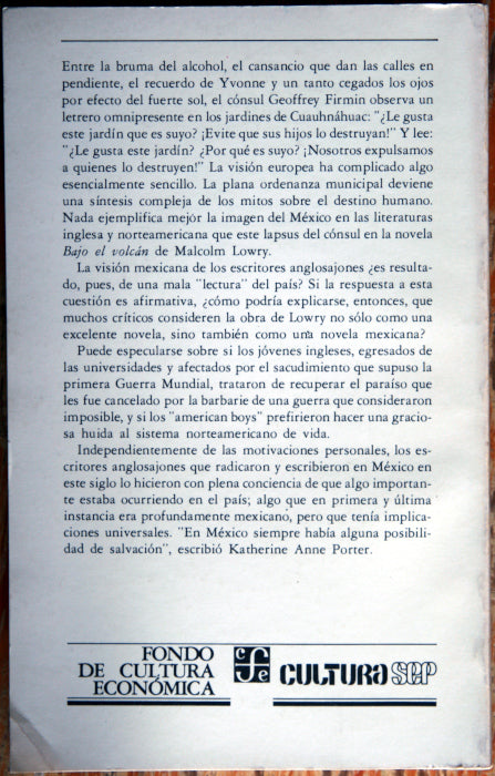 "La visión mexicana de los escritores anglosajones ¿es resultado, pues, de una mala "lectura" del país? si la respuesta a esta cuestión es afirmativa, ¿cómo podría explicarse, entonces, que muchos críticos consideran la obra de Lowry no sólo como una excelente novela, sino también como una novela mexicana?"