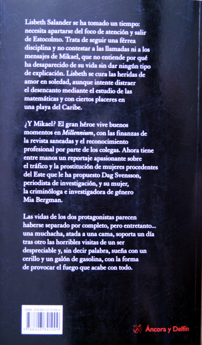 Lisbeth Salander se ha tomado un tiempo: necesita apartarse del foco de atención y salir de Estocolmo. Trata de seguir una férrea disciplina y no contestar a las llamadas ni a los mensajes de Mikael, que no entiende por qué ha desaparecido de su vida sin dar ningún tipo de explicación. Lisbeth se cura las heridas de amor en soledad, aunque intente distraer el desencanto con el estudio de las matemáticas y ciertos placeres en una playa del Caribe. ¿Y Mikael? El gran héroe, Súper Blomkvist, vive buenos momentos en Millennium, con las finanzas de la revista saneadas y reconocimiento profesional por parte de colegas y otros medios. Ahora tiene entre manos un reportaje apasionante sobre el tráfico y la prostitución de mujeres procedentes del Este que le han propuesto una pareja, Dag y Mia. Las vidas de nuestros dos protagonistas parecen haberse separado por completo en este segundo volumen de la trilogía más adictiva de los últimos años, pero algo conspira para reunirles, algo que tiene que ver con el recuerdo de una chica, atada a una cama, que soporta un día tras otro las horribles visitas de un ser despreciable y, sin decir palabra, sueña con un cerillo y un galón de gasolina, para provocar el fuego que acabe con todo.