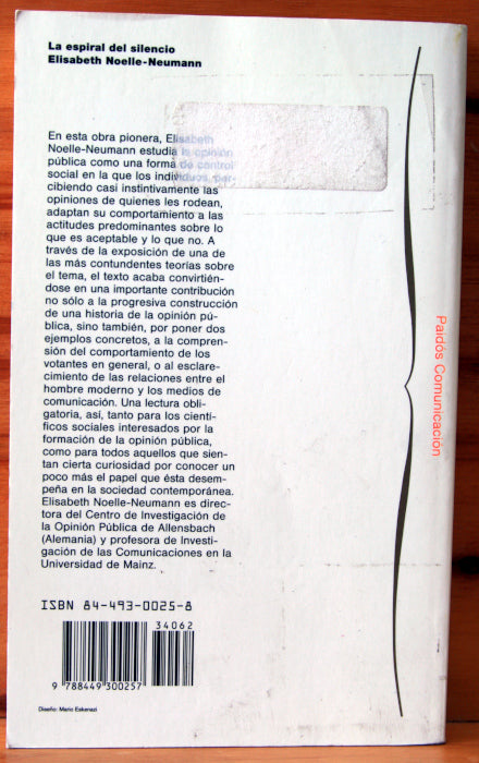 Elisabeth Noelle-Neumann, Ediciones Paidós, 1995, 332 páginas. Este libro presenta sellos en guardas y cantos, es un ejemplar expurgado de biblioteca escolar y adquirido por El Árbol, librería de uso a través de una donación.