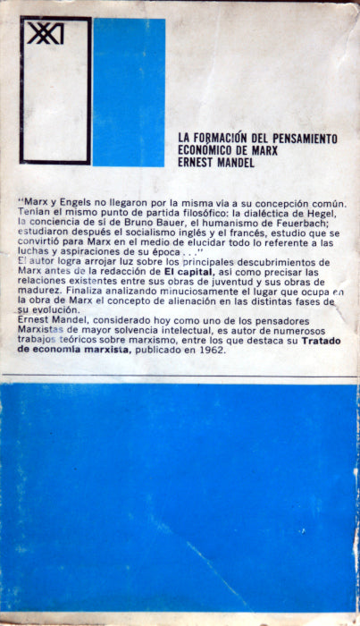 En su libro La formación del pensamiento económico de Carlos Marx, el economista, historiador y político belga de origen alemán Ernest Mandel nos entrega un minucioso estudio de las obras de Marx desde 1843 hasta la realización de su obra cumbre, El capital. Mandel presenta al lector el proceso evolutivo mediante el cual Marx se nutre y fortalece, contrasta, sustituye y va perfilando sus concepciones teóricas. Significativa importancia concede, especialmente en el último capítulo, a profundizar en el papel de la categoría «enajenación» en el pensamiento marxista, y su relevancia para comprender la dinámica del capitalismo.