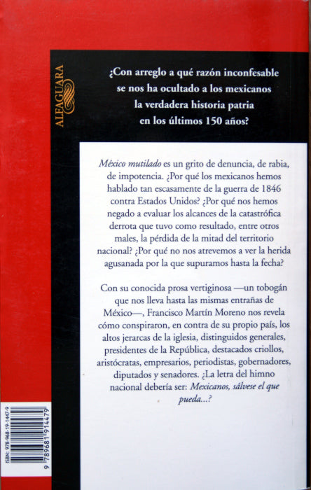 México mutilado es un grito de denuncia, de rabia, de impotencia. ¿Por qué los mexicanos hemos hablado tan escasamente de la guerra de 1846 contra Estados Unidos? ¿Por qué nos hemos negado a evaluar los alcances de la catastrófica derrota que tuvo como resultado, entre otros males, la pérdida de la mitad del territorio nacional? ¿Por qué no nos atrevemos a ver la herida agusanada por la que supuramos hasta la fecha? Con su conocida prosa vertiginosa, Francisco Martín Moreno nos revela cómo conspiraron, en contra de su propio país, los altos jerarcas de la iglesia, distinguidos generales, presidentes de la República, destacados criollos, aristócratas, empresarios, periodistas, gobernadores, diputados y senadores. ¿La letra del himno nacional debería de ser: Mexicanos, sálvese el que pueda...? ¿Qué aprendimos de la guerra y de la traumática experiencia? ¿Acaso hoy, a más de 170 años, los mexicanos somos más unidos, más cultos, más preparados y hemos disminuido la distancia que nos separa de Estados Unidos? Por lo visto, nadie repara en que quien no conoce su historia está condenado a repetirla, con todas sus funestas consecuencias. Sin duda, los intereses creados fueron de tal magnitud que resultó más conveniente esconder la realidad que echar luz sobre nuestro pasado para desenmascarar, de una vez y para siempre, a los auténticos enemigos de México. México mutilado es una novela política que nos arroja en pleno rostro las explicaciones que nunca se atrevieron a darnos.